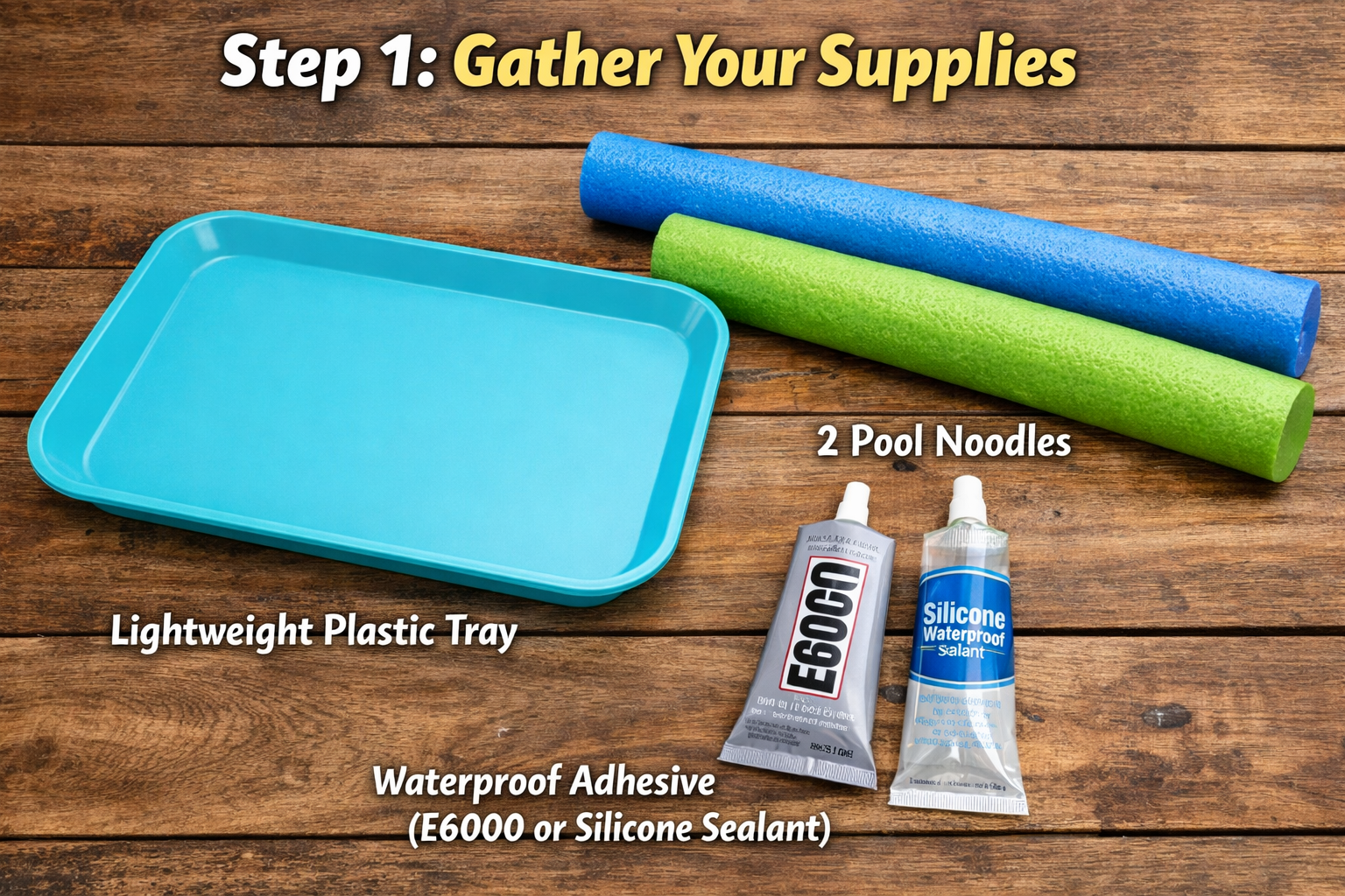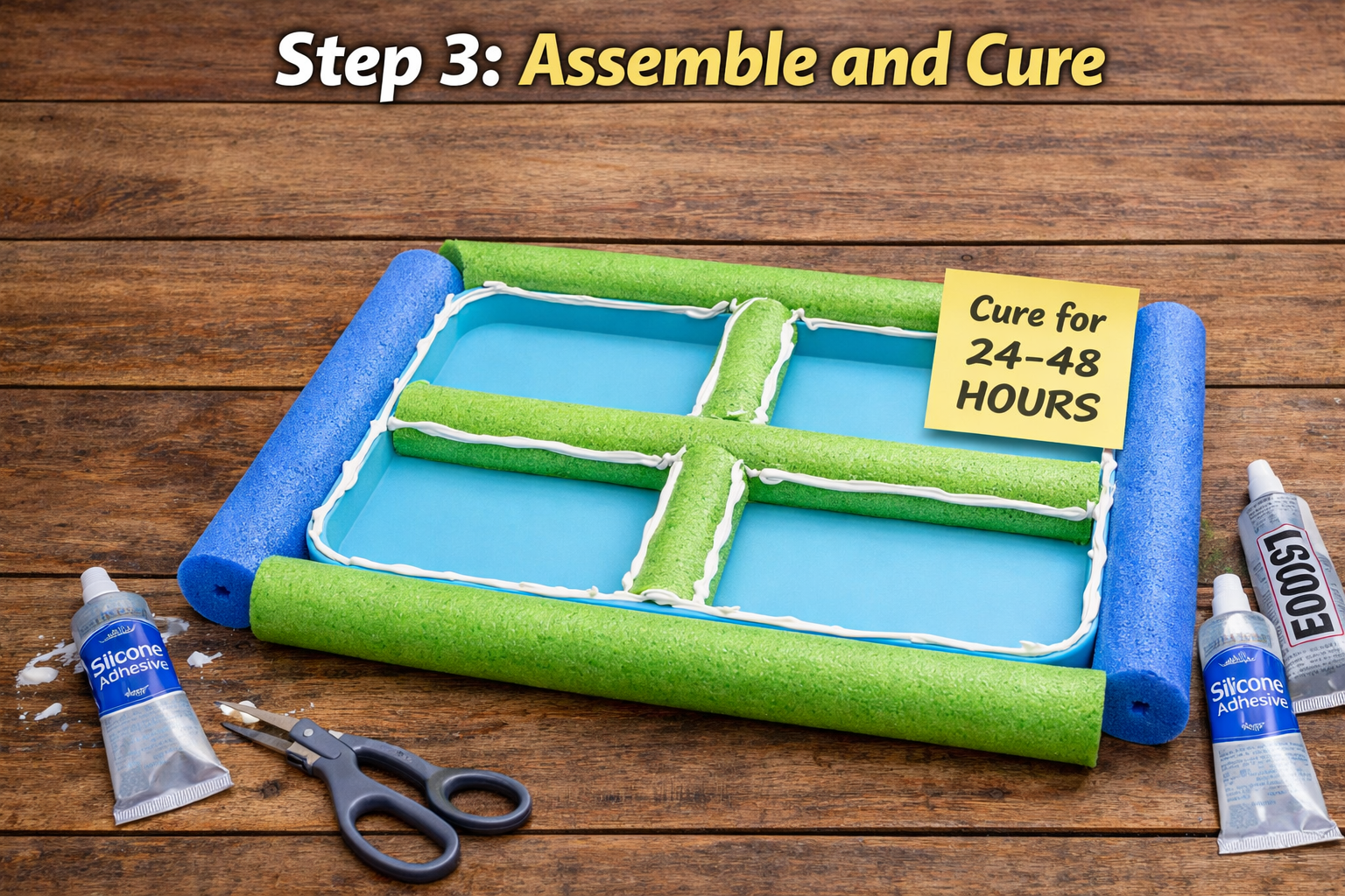 Dry-fit your pieces first, then apply a generous bead of adhesive. Crucial Step: Let the glue cure for a full 24–48 hours. If you jump in the pool too early, the chlorine and water will break down the bond, and your snacks will go for a swim.